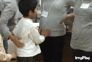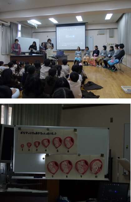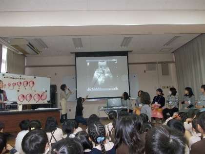 おなかの中の赤ちゃんの様子を、動画で見たり、説明を聞いたりしました。そして、妊婦さんへの質問タイムのあと、妊婦さんのおなかにさわらせてもらいました。