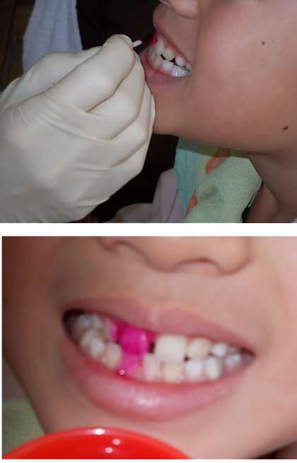 最後に、みがいた歯をまた染めて、きれいに磨けたか、確認します。