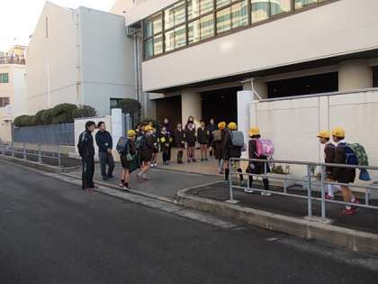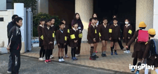 運営委員・代表委員が、門に立って、あいさつを呼びかけます。