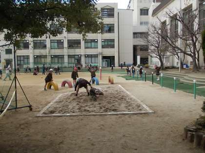 休み時間には走り幅跳びをして遊ぶ子どもがいました。