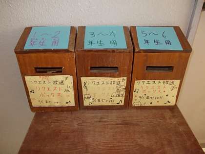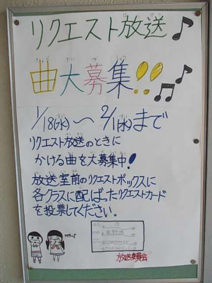 「リクエスト放送(給食時間)の時に、流してほしい歌の募集をする」とのことです。放送室の前のリクエストボックスに、クラスで配られたリクエストカードに書いて入れます。