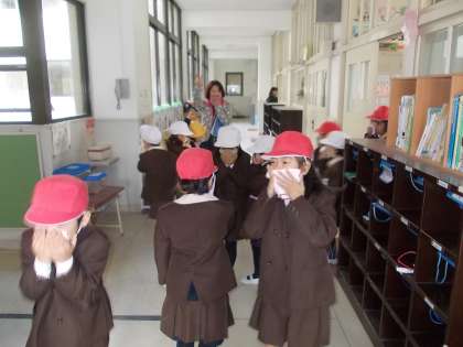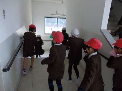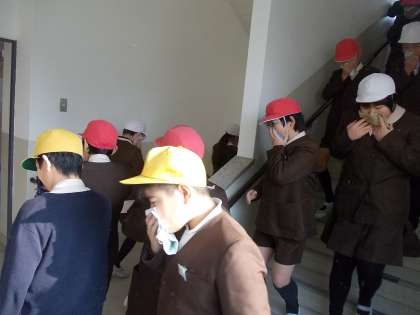 初めに「家庭科室から出火」という設定で避難訓練をしました。