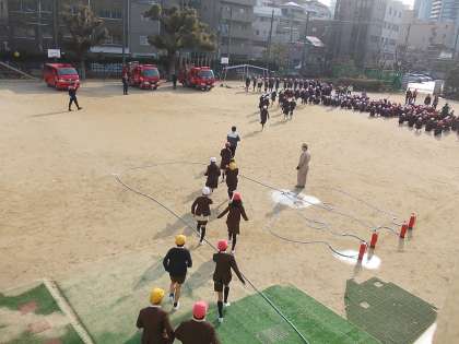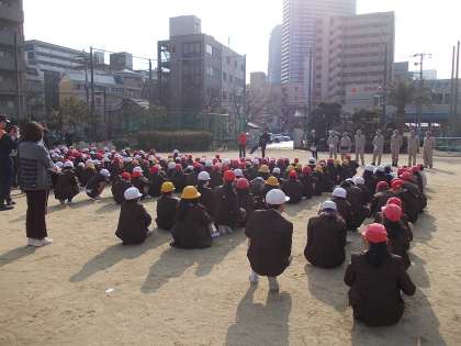 避難訓練、校舎内(廊下・階段)では歩きますが、運動場にでると、走ります。