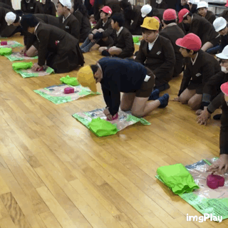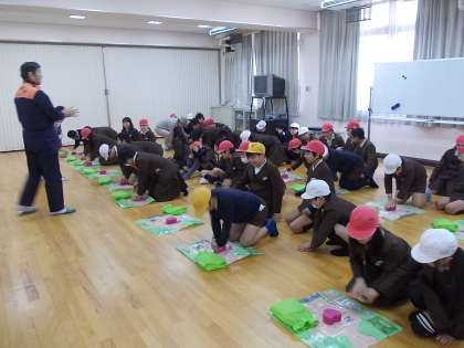 1分間に100回以上の速さで押しこみます。腕を伸ばして、全体重を乗っけて押すのが難しそうな子もたくさんいました。うまく押せると、「キュッキュ」という音がなります。「救急隊員が到着するまで押し続けなければいけないんだよ」と聞いて、びっくりしてました。