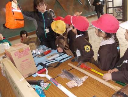 普段は、講堂の3階備蓄倉庫や、1階の備蓄ロッカーに保管してある防災救助備品の中から、1部を展示しました。