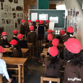 昭和30年〜40年代に使われてた机と椅子に座りました。2人の机がくっついてます。