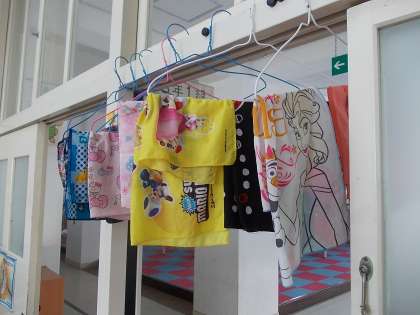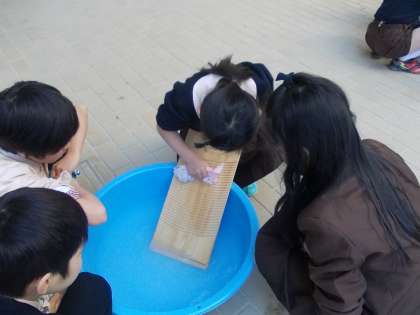 1組で洗たく板を使って洗濯をしました。