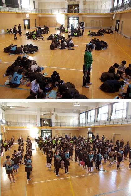 児童集会のときに、たてわり班にわかれて、卒業生へのメッセージカードを作成しました。