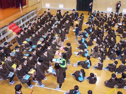 6年生から手作り雑巾が、クラスの代表者に渡されました。