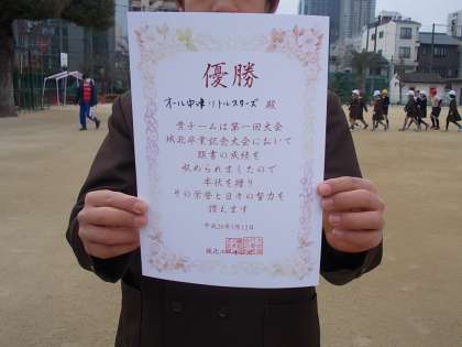 先週に引き続き、またまた優勝です。「第1回城北卒業記念大会」、8チームの中の優勝です。おめでとう!