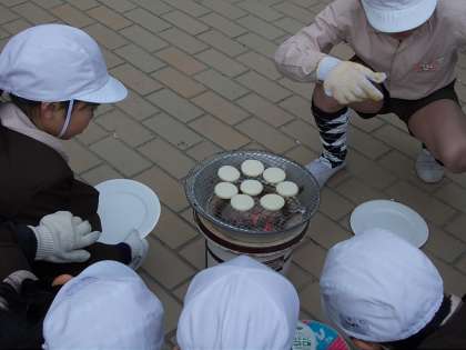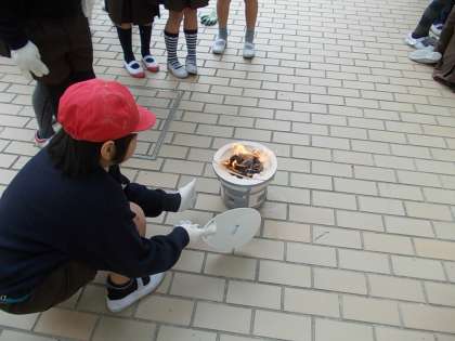 社会科の学習として、七輪で炭をおこしてお餅を焼きました。
