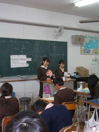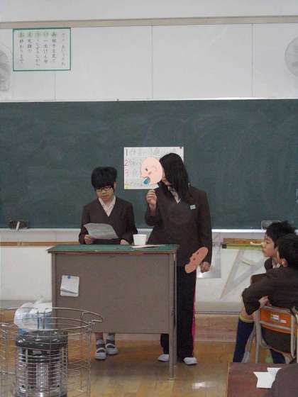 保健委員が給食時間にそれぞれの学級へ行き、ガラガラうがいの仕方についてペープサートを使って説明しました。