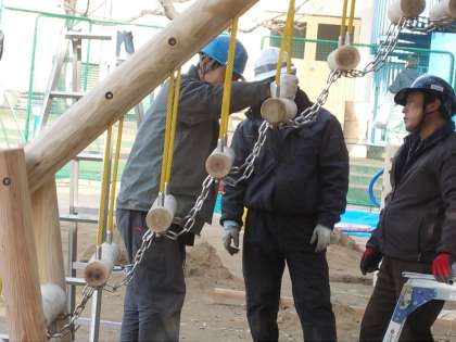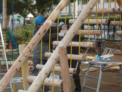 順調に工事が進んでいます。このアスレチックは、日本公園施設業協会「遊具の安全に関する基準」に適合したもので、この基準に定められた安全領域を確保して設置しています。また、日本公園施設業協会認定の「SP表示認定企業」の管理下で製作されています。このように、安全を第一とした条件を付けて入札をして決めたものです。中津小の子どもたちに、安心して安全に使ってほしいと願っています。