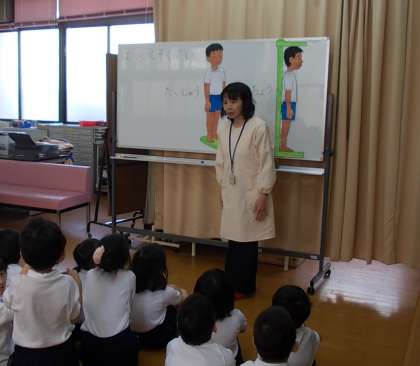 1年生の初めての健診は、発育測定です。体重と身長を測りました。保健室の使い方や、保健室の中の様子も知りました。