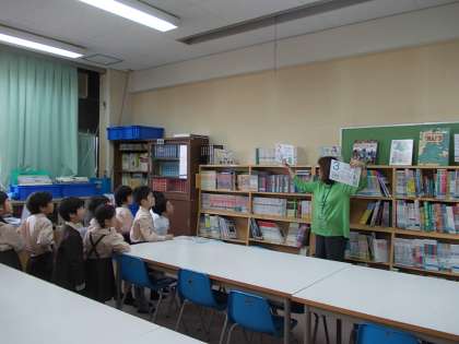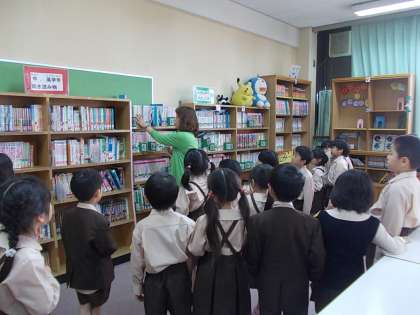 図書館補助員の仲先生が、毎週火曜日に中津小学校に来られます。今日は1年生に図書室の使い方などのオリエンテーションがありました。