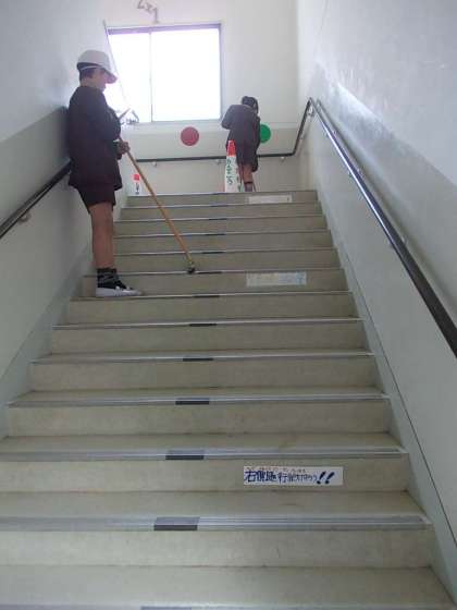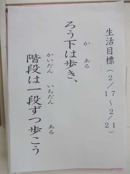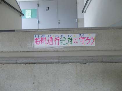 代表委員会の児童が作った、安全な歩行についてのカードを、階段に掲示しました。