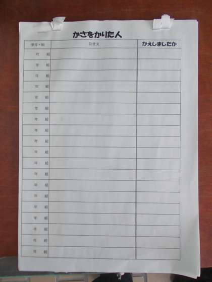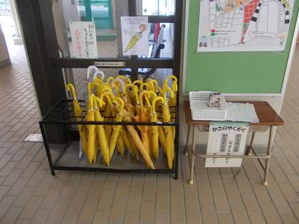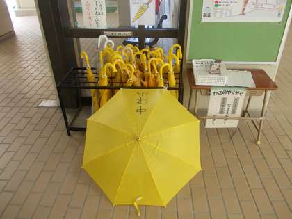 学校の玄関を入って正面の傘たてに、黄色い傘を置いています。平成22年にそれまでためていたベルマーク(PTA活動)で購入したものです。(もう7年も前です。大事に使えていますね。感心です。)傘が必要な時に貸し出しています。先日の自然学習の出発のとき(バスに乗るまで)にもみんなが使いました。