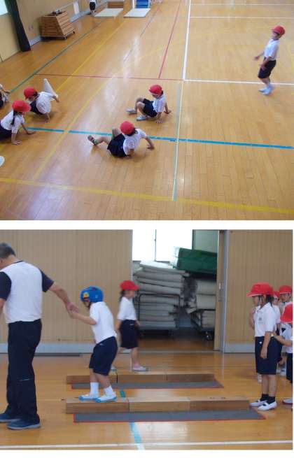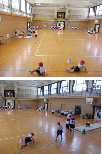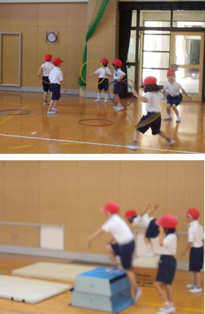講堂でいろいろな動きのコーナーを作って楽しみました。
