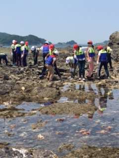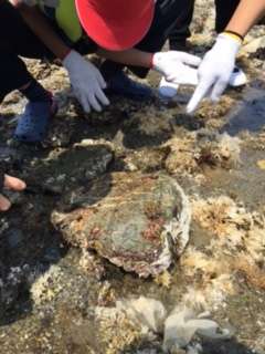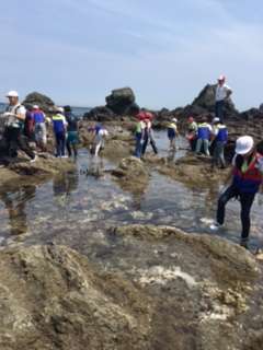 岩を少し上げてみるとたくさんのナマコやウニ、ヒトデなどが発見できます。恐る恐るの子ども達もだんだん慣れてきました。風が涼しく、穏やかな日差しです。