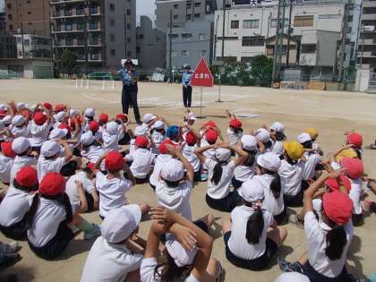 低学年(1〜3年生)は、横断歩道を渡るときに必要な心得や安全な歩行の仕方を身につけるために、大阪府警から2名、大淀警察交通課から2名の方に来ていただき、お話していただきました。