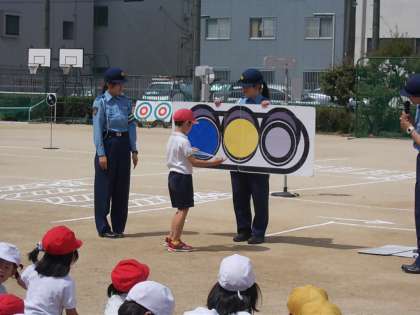 止まれの標識の〇×クイズや、信号機の赤青黄の順番、安全確認の右左右の大切さについて教えていただきました。また、「黄色」の時は渡らないと、教えていただきました。