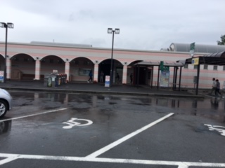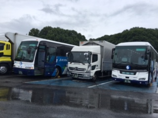 一回目の休憩場所の赤松に着きました。雨は、少し降っており、涼しいです。団体バスはあまり停まっていません。バスの中では、バスレク係さんが頑張っています。