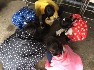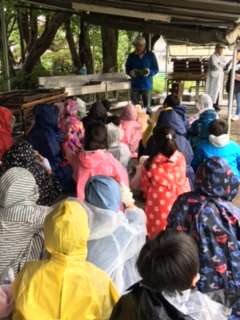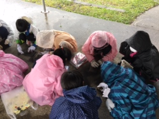ご主人から説明を受けて、さっそく焼いた板をタワシで磨き始めました。子ども達は、寒さと風の中、ひたすら磨いています。