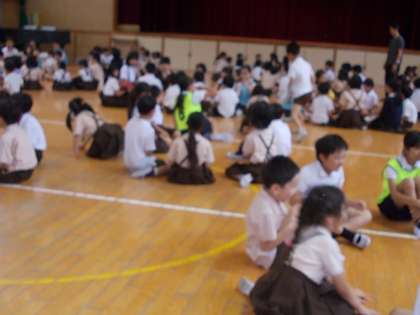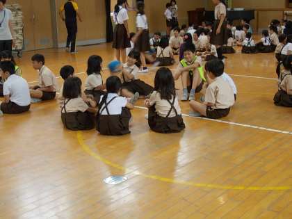 集会委員が「ゴロゴロ・・・」といっている間、となりの人にボールを渡していきます。「ピカピカ・・・」と言ったら、ボールを逆の方向へ渡します。