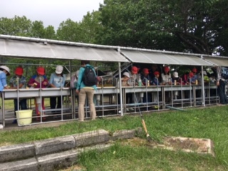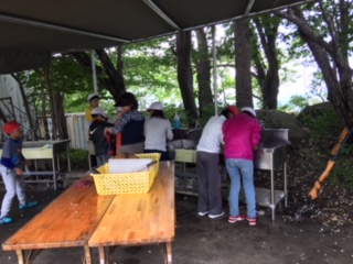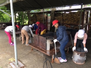 お鍋やカマドに付いた真黒い炭をこすって落としたり、綺麗に掃き出したりしてみんな必死に片付けをしています。無言で頑張っている姿が立派です。