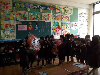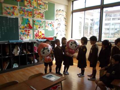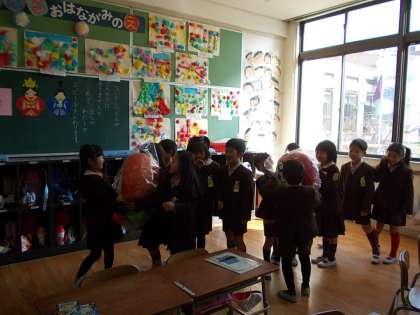 1年生が人KENまもる君と人KENあゆみちゃんを仲良く抱っこして遊びました。仲良く助け合う中津の子に育ってほしいです。月曜日の朝会で全校にもお披露目します。