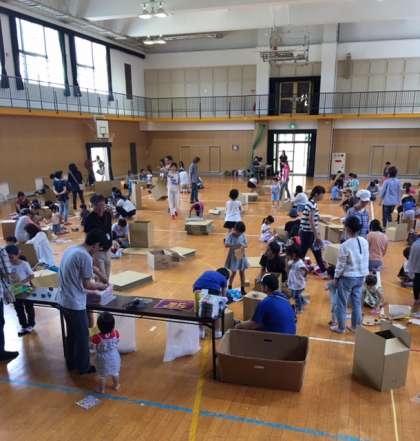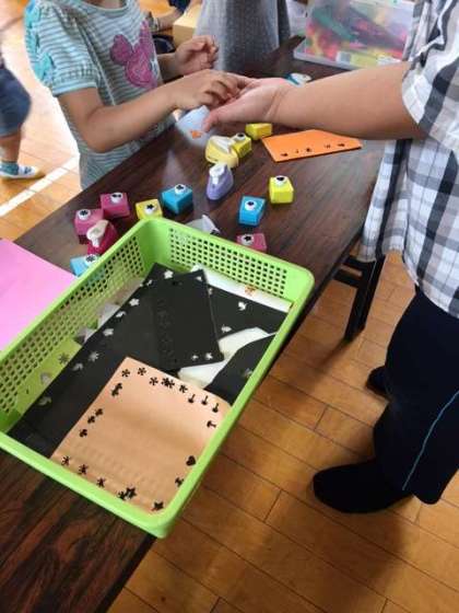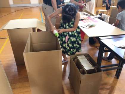 豊富なダンボールはもちろんのこと、折り紙やパッケージなどの材料とボンドやカッター、型抜きパンチなどのたくさんの道具が用意されていました。