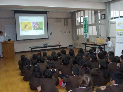 今日は、その梅田ミツバチプロジェクトさんをゲストティーチャーに招き、「ミツバチを育てることが、緑をふやすことにながる」 学習会をしました。