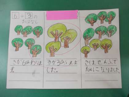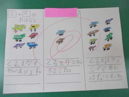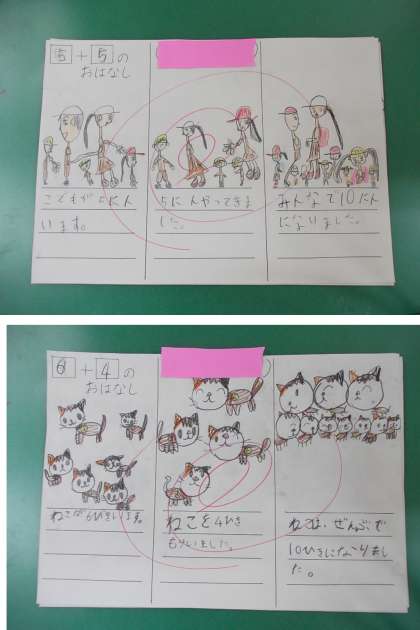 たし算の学習のまとめに、自分で□+□のおはなしを作りました。