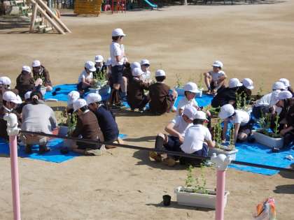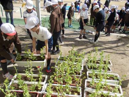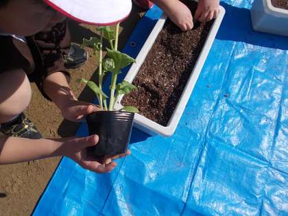 ポットから菜の花をやさしく取り出し、土を入れたプランターにくぼみをつけて、植え替え作業をしました。1つのプランターに4本植え替えました。