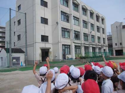 教室で飼ってた(いや、ただ単に学習園のキャベツについてたモンシロチョウの卵をとってきただけですが・・・)卵がさなぎになり、成虫にかえったので、みんなでサヨナラしました。