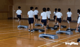 これは、体育です。リズミカルな曲に乗ってみんなで、ステップ台を使ってダンスをしています。すごくかっこいいです。