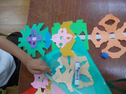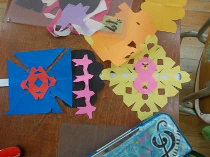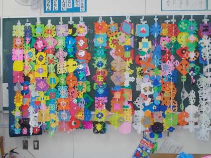 折って切ったかざりを紙テープにはり、きれいな飾りができました。