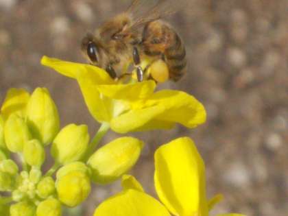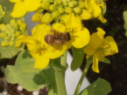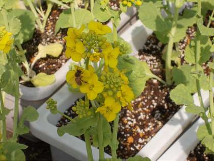 花いっぱいまちづくりプロジェクトで育てている菜の花にミツバチがやってきました。梅田のビルの屋上からどうやって見つけてくれたのでしょうか。足には花粉がたくさんついています。これからもっともっとミツバチが来てくれるとうれしいですね。