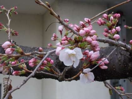 雨が上がって静かな朝です。クスノキは葉を落とし新しい葉と変わります。サクラは蕾も色づいてきました。レンゲも大きくなりました。