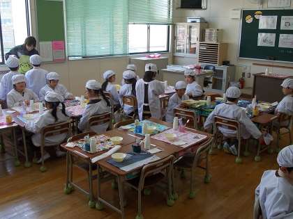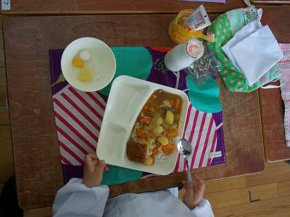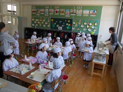 1年生の初めての給食は、カツカレーライスとフルーツ白玉です。小学校の入学のお祝いの献立です。6年生が運んでくれました。みんなで一緒に楽しくいただきました。