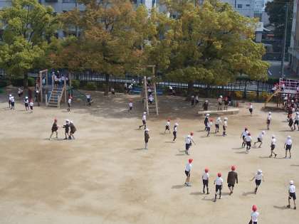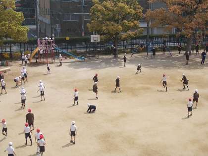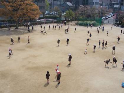 運動場で元気に遊んでいます。学級でみんな遊びをしているクラスもあります。アスレチックも人気です。