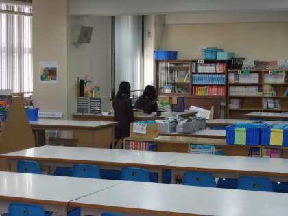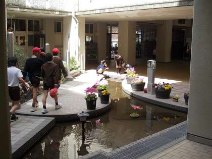 20分休憩に図書室開放をしています。しかし、今日はいいお天気でみんな外遊びに夢中で来室者は0でした。残念ですが、図書委員会は頑張っています。光庭では、金魚を眺める姿もありました。