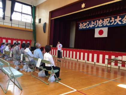 中津地域社会福祉協議会 会長の挨拶、来賓の上野区長の挨拶の後、結婚50年や100歳以上の方の記念品が贈呈されました。