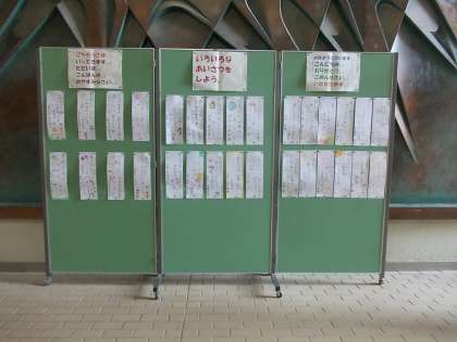 玄関ホールに何人かクラスの代表の「あいさつ標語」が掲示してあります。是非見に来てくださいね。