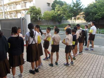 登校した運営委員・学級代表が、校門に立ってあいさつ運動を盛り上げます。