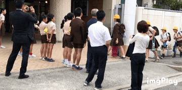 黄色い腕章をつけた運営委員、学級代表が門に立って、あいさつ運動をもりあげます。
