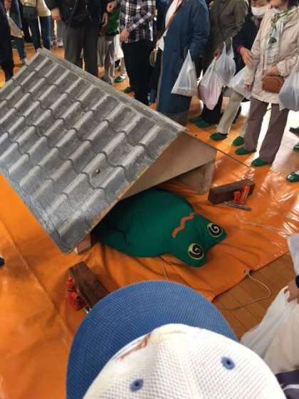 各町会からの参加者の方が全員集合した後は、3つのグループに分かれて模擬訓練をしました。グループは、「水消火器・煙中体験」「応急処置の体験」「つぶれた家屋からの救出体験」の3つです。参加した中には、「オール中津リトルスターズ」のメンバーもいて、それぞれの体験をしっかり話を聞いてやっていました。