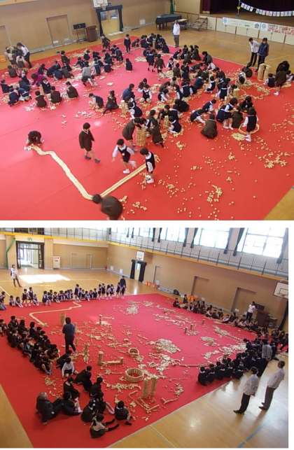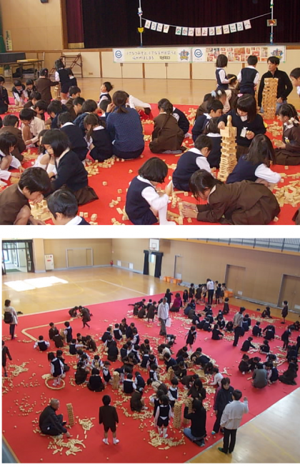 1年生と、中津相愛幼稚園(年長)、中津保育園(年長)の128名が交流する「森のつみ木広場」を公益財団法人オイスカ関西支部の方々の協力のもと、実施しました。