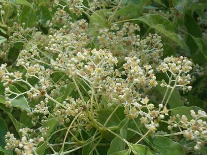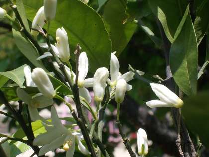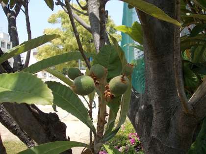 ナツミカンの花の甘酸っぱい香りが漂っています。ビワに小さな実がなっています。クスノキが満開です。