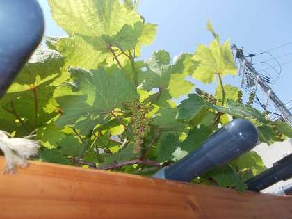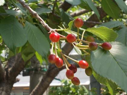 オオシマザクラにサクランボができています。ブドウの木も蕾をつけています。